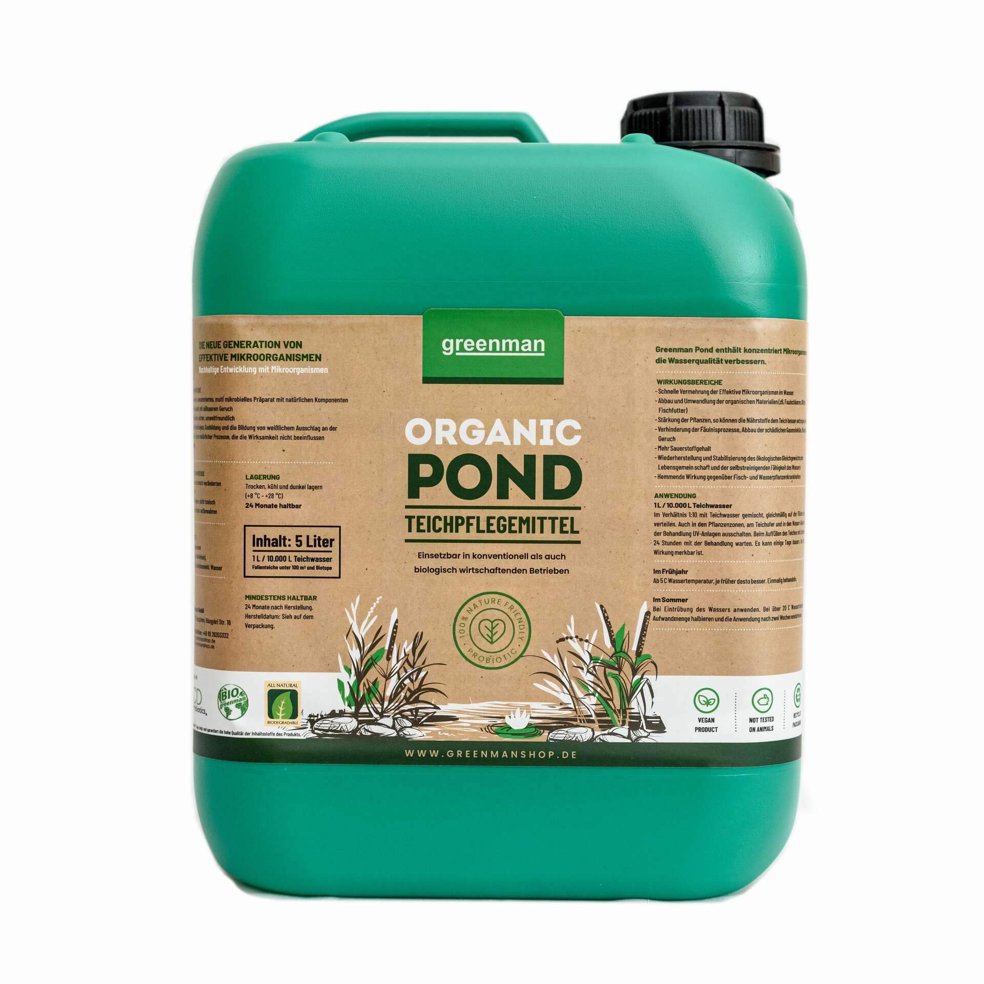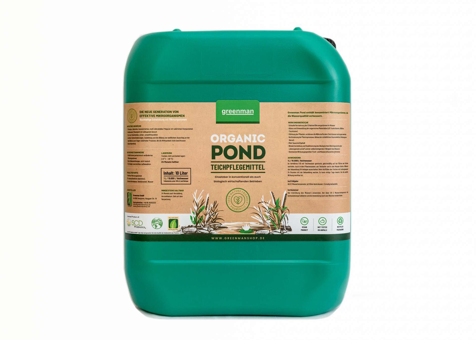 - Dosering: Het wordt aanbevolen om elke 4 weken 1 liter Greenman Pond toe te voegen per 10.000 liter (10 m³) water.